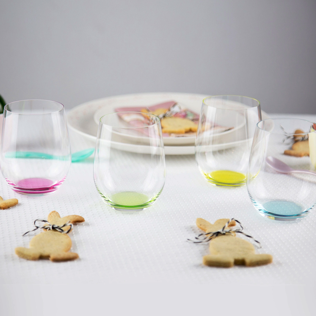 Veseli set RIEDEL Happy O – čaše bez stopice – uključuje 4 staklene čaše u boji (ružičasta, zelena, žuta i plava) koje unose zabavne tonove na sto. Ove šarene čaše za vino, vodu, sok ili koktele savršene su za svakodnevnu upotrebu i druženja.