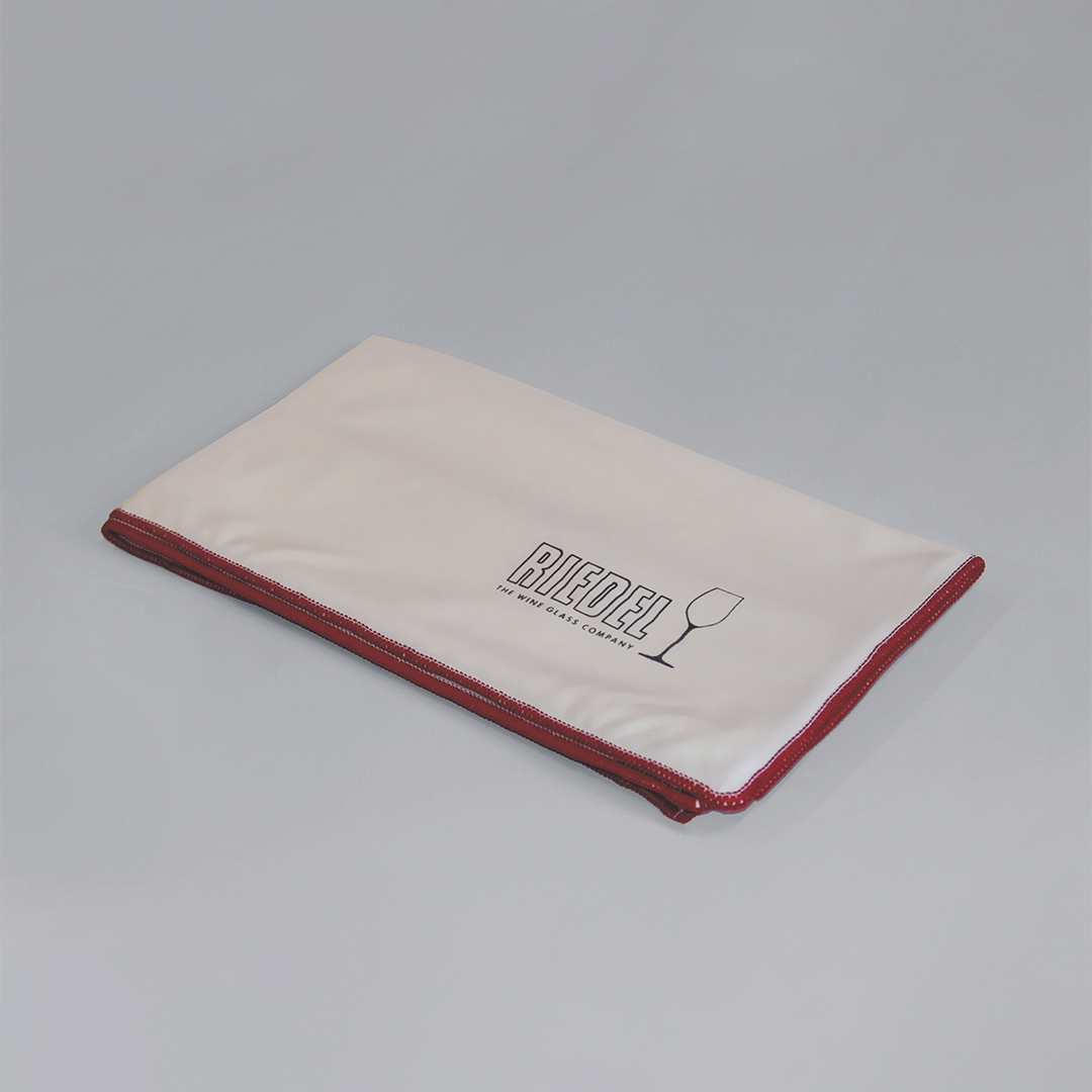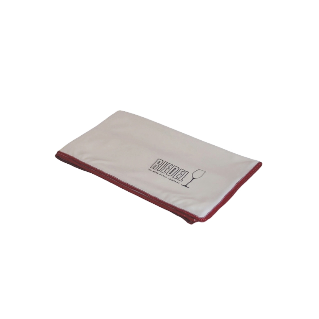 Velika mikrofiber krpa za poliranje stakla dimenzija 50×64 cm (19,69×25,2 inča) bele je boje, sa crvenim obrubom i RIEDEL logotipom u donjem desnom uglu.