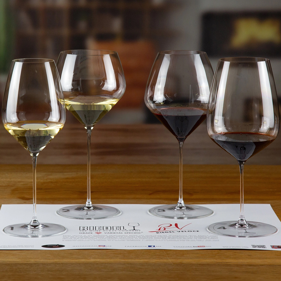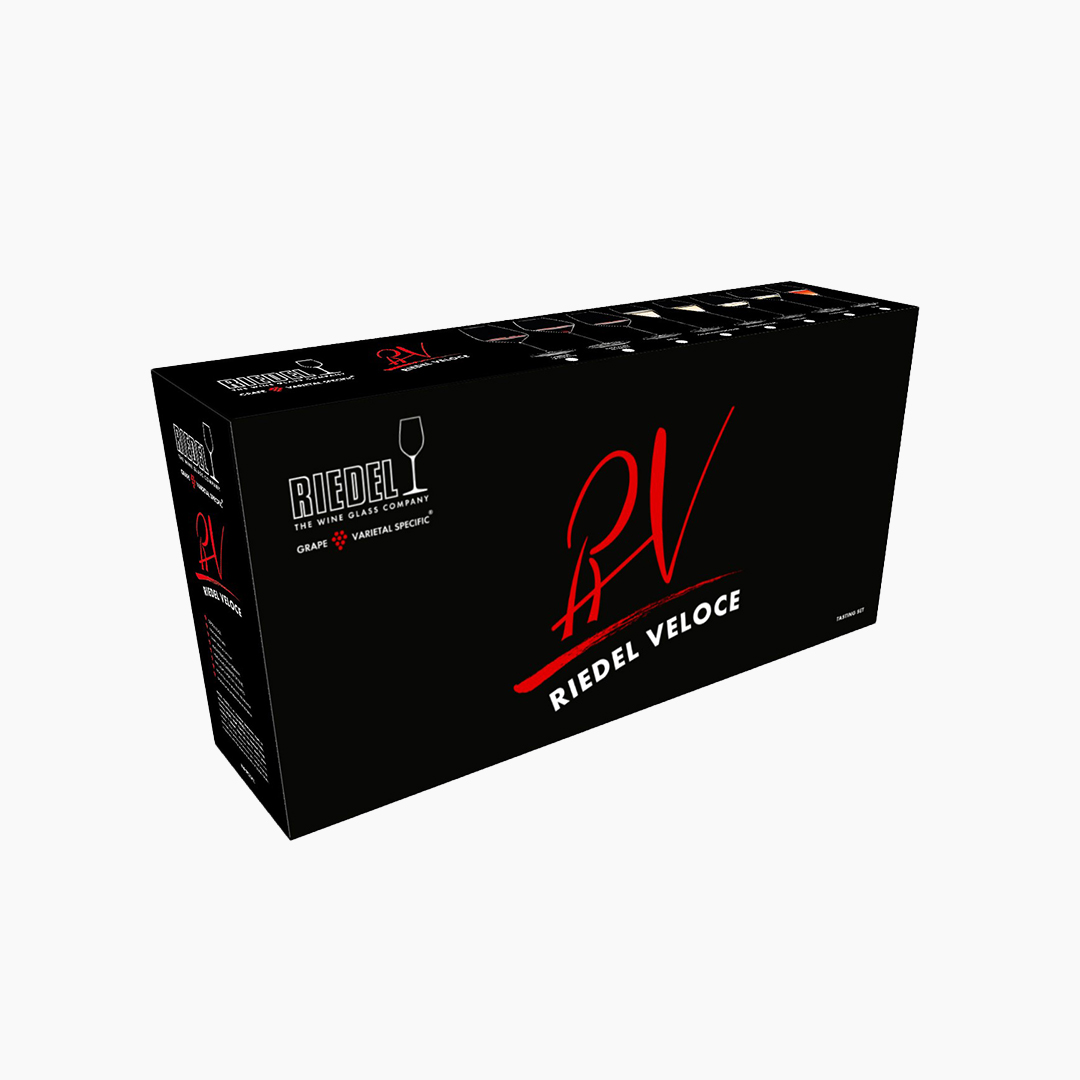 Degustacioni set (Tasting Set) sadrži 4 kristalne čaše iz serije RIEDEL Veloce: Cabernet, Pinot Noir (pino noar), Sauvignon Blanc (sovinjon blan) i Chardonnay (šardone).